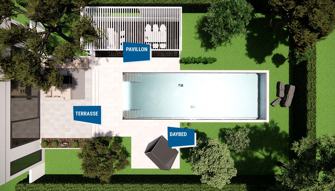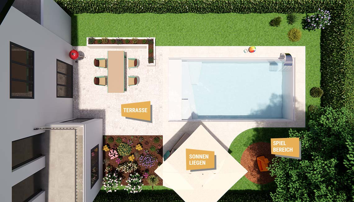 Der Garten ist in zwei Bereiche unterteilt: Eine Terrasse am Haus aus fein gezeichnetem Naturstein und ein Pooldeck aus gleichmäßigem Beton. Dazu gesellen sich Rasenflächen und ein Spielbereich aus Rindenmulch.