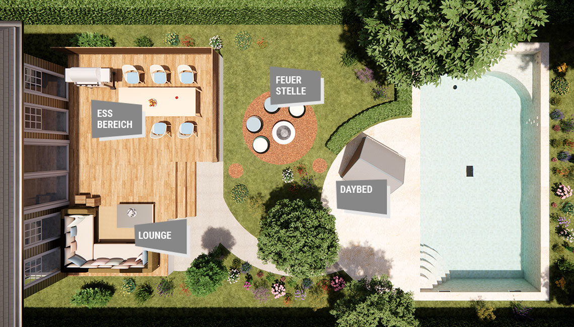 Ob Sonnenbaden, Schwimmtraining, Yoga oder geselliges Beisammensein mit Freunden und Kollegen – eine großzügige Anlage bietet alles, was den Ausgleich zum stressigen Arbeitsalltag ausmacht.