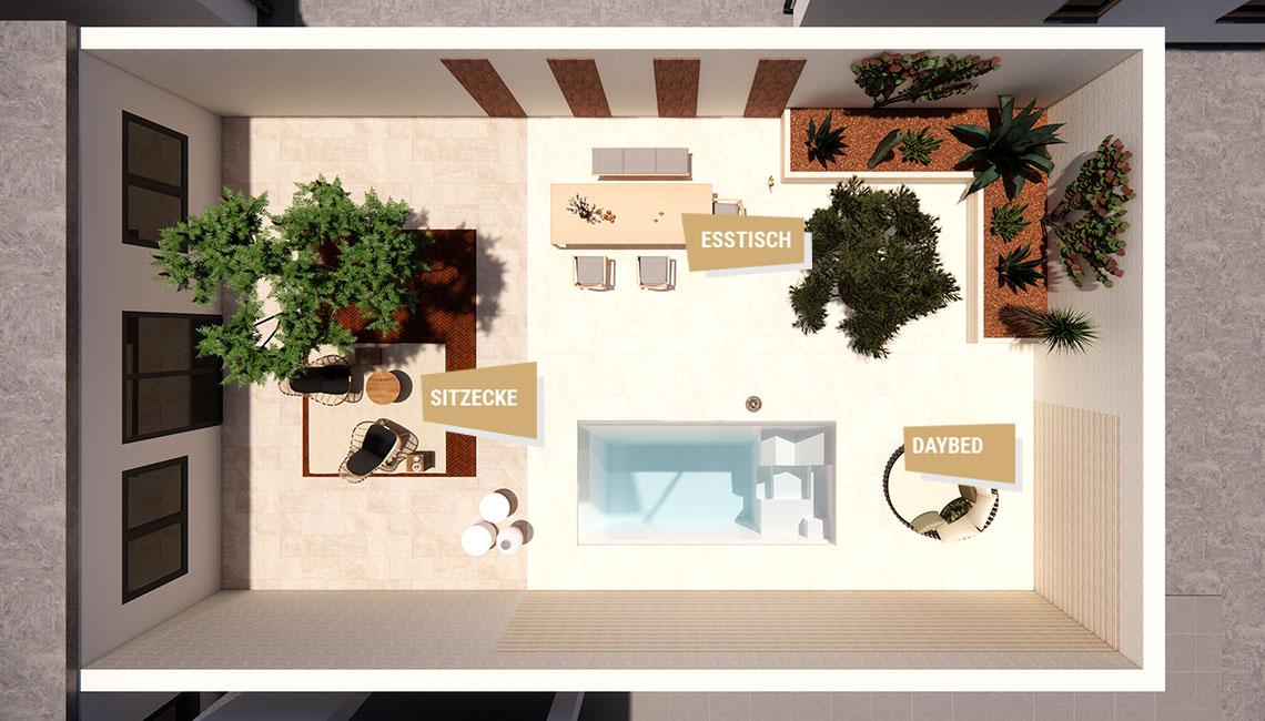 Ein moderner Bungalow mit Flachdach und einem windgeschützten Innenhof bietet ideale Voraussetzungen für einen minimalistischen Stadtgarten mit mediterranem Flair.